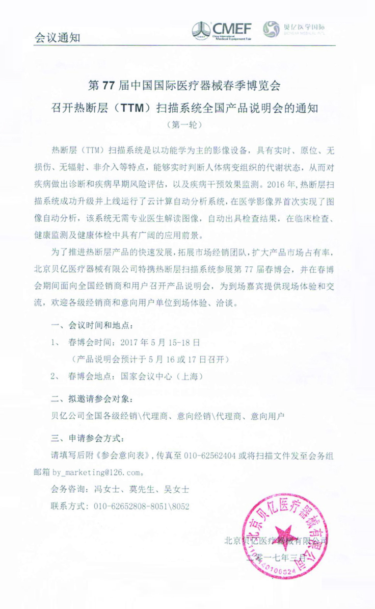 關于第77屆中國國際醫(yī)療器械博覽會 召開熱斷層(TTM)掃描系統(tǒng)全國產(chǎn)品說明會的通知 (第一輪)